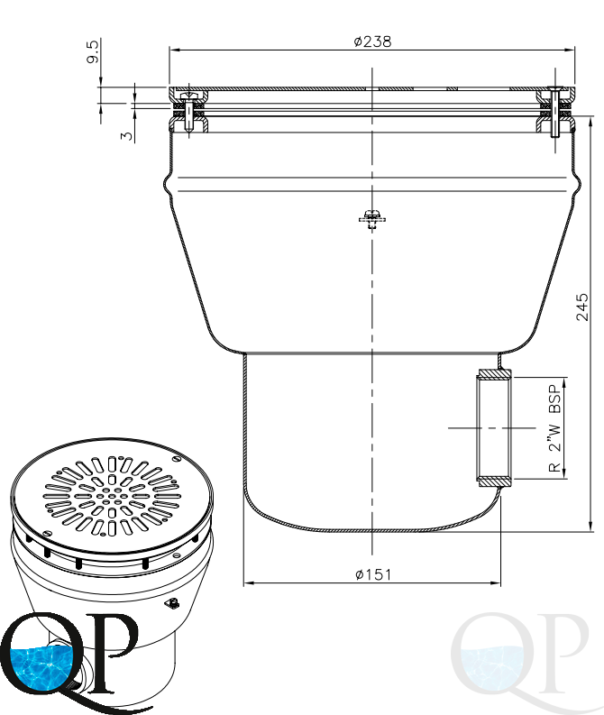 СЛИВ ДОННЫЙ КРУГЛЫЙ 2", НИЖНЕЕ ПОДКЛЮЧЕНИЕ 1 1/2", ДЛЯ ПЛЕНОЧНЫХ БАСЕЙНОВ, AISI-316
