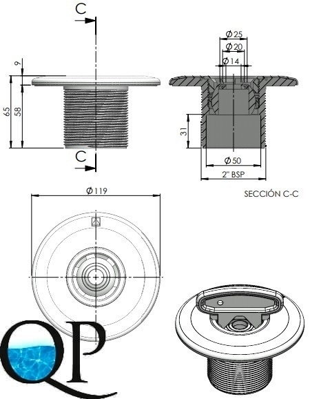 Форсунка возврата воды предназначена для подачи воды в бассейн в режиме наполнения и рециркуляционном водообмене. Применяется в бассейнах, облицованных плиткой или мозайкой.