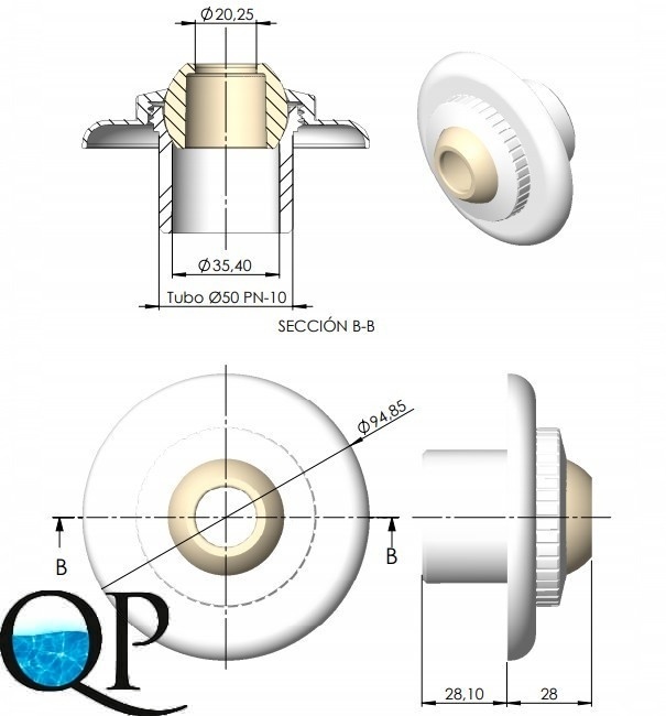 Форсунка возврата воды предназначена для подачи воды в бассейн в режиме наполнения и рециркуляционном водообмене. Применяется в бассейнах, облицованных плиткой или мозайкой.