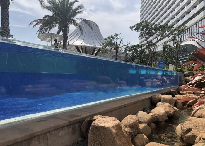 Акриловое стекло, использованное в бассейне, является популярным видом прозрачного пластика, известным своей высокой светопропускной способностью, эластичностью и прочностью. Оно в 3 раза легче и в 5 раз прочнее обычного стекла. При больших повреждениях акриловые осколки остаются безопасными, поскольку не имеют острых краёв.