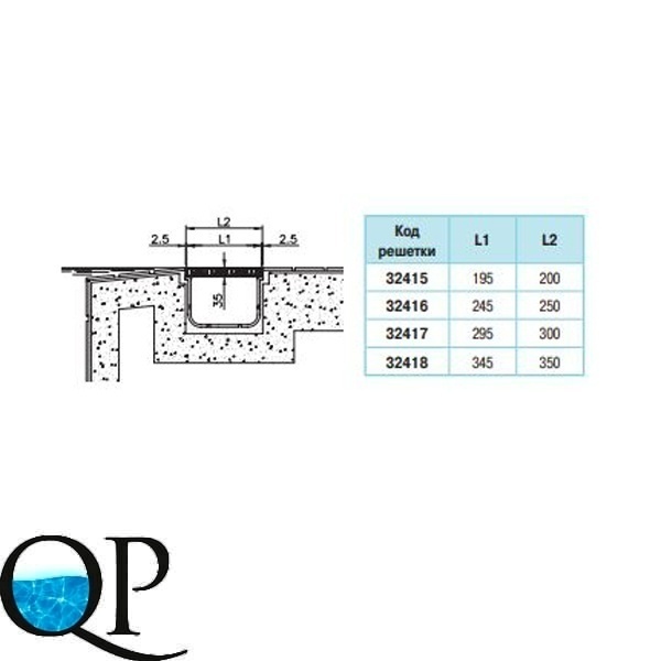 Продольная переливная решетка из нержавеющей стали. Представляет собой прямые секции из нержавеющей стали AISI-304, 500 мм в длину. Канал должен быть на 5 мм шире, чем решетка для обеспечения легкой сборки. Метал с нескользящей поверхностью.