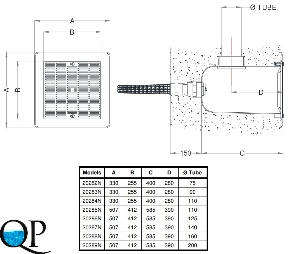 Слив донный NORM для бет. бас., квадратный, 330 x 330, бок. 110 мм, реш. AISI-316