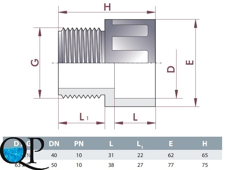 ПЕРЕХОДНАЯ МУФТА ПВХ "IDRANIA" (КЛЕЕВАЯ-НАР.РЕЗЬБА BSP) DXG 50 X 1 1/2", PN10