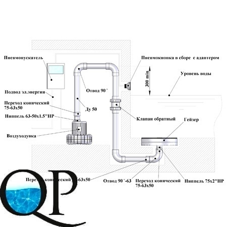 Гейзер или аэромассажный элемент для бассейна, представляет собой решетчатое плато, изготовленное из полированной нержавеющей стали. Гейзер рассеивает нагнетаемый воздух, в результате чего образуется множество пузырьков, которые поднимаются из толщи воды и создают эффект бурления. Благодаря этой особенности производится мягкий массаж.