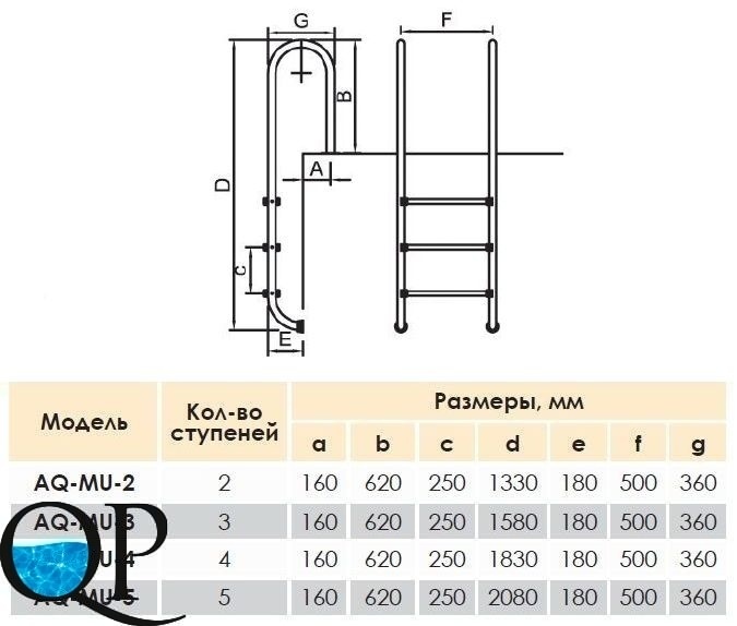Монтаж лестницы выполняется в верхней части бассейна при помощи болтов из нержавеющей стали и закладного стакана (анкера). Нижняя часть лестницы упирается в стену бассейна резиновыми заглушками. Крепеж не нарушает гидроизоляцию чаши бассейна.