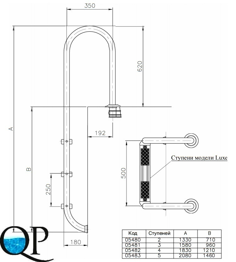 Каркас, поручни и нескользящие ступеньки типа Luxe с пластиковыми вставками изготовлены из нержавеющей стали.