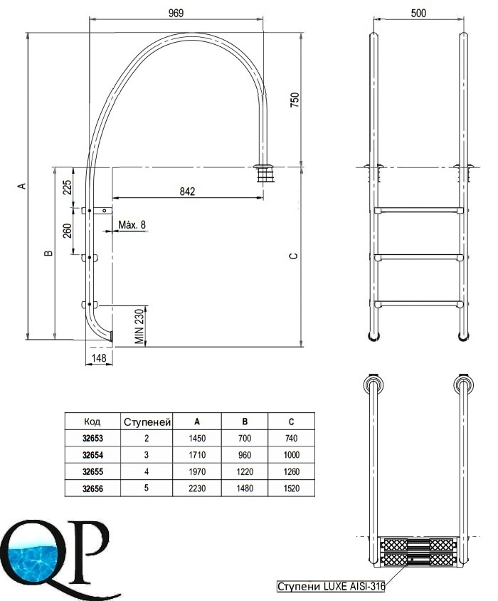 Каркас, поручни и нескользящие ступеньки типа Luxe изготовлены из нержавеющей стали.