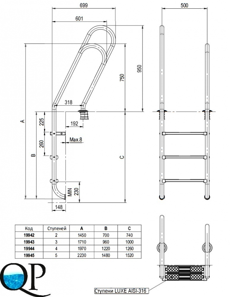 Каркас, поручни и нескользящие ступеньки типа Luxe изготовлены из нержавеющей стали.