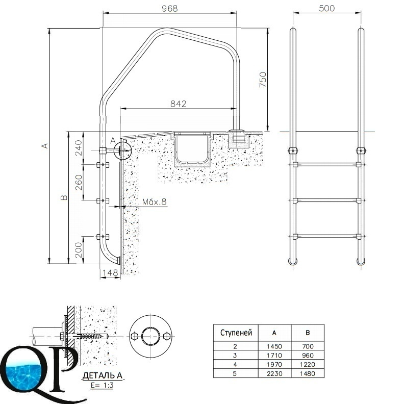 Лестница предназначена для использования в бассейнах переливного типа. Модель выполнена в соответствии со стандартами EN 13451-1 и EN 13451-2.