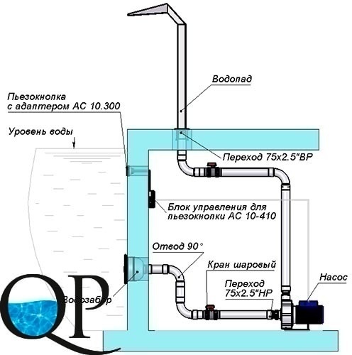 Принцип действия водопада заключается в нагнетании воды насосом по напорному трубопроводу в форсунку водопада, откуда происходит истекание воды сплошной «зеркальной стеной» в чашу бассейна.