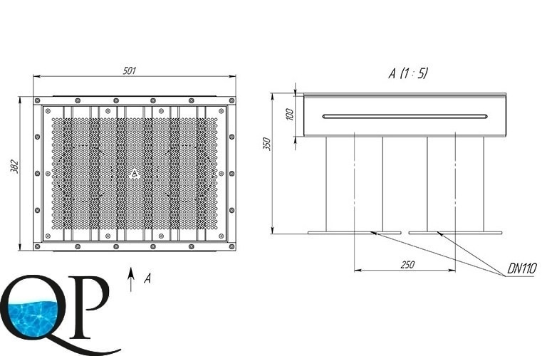 Водозабор рассчитан на высокий расход воды и применяется, в основном, при использовании мощных насосов в бассейнах, облицованных плёнкой. Элемент состоит из закладной детали и перфорированной решётки. Изготовлен из нержавеющей стали.