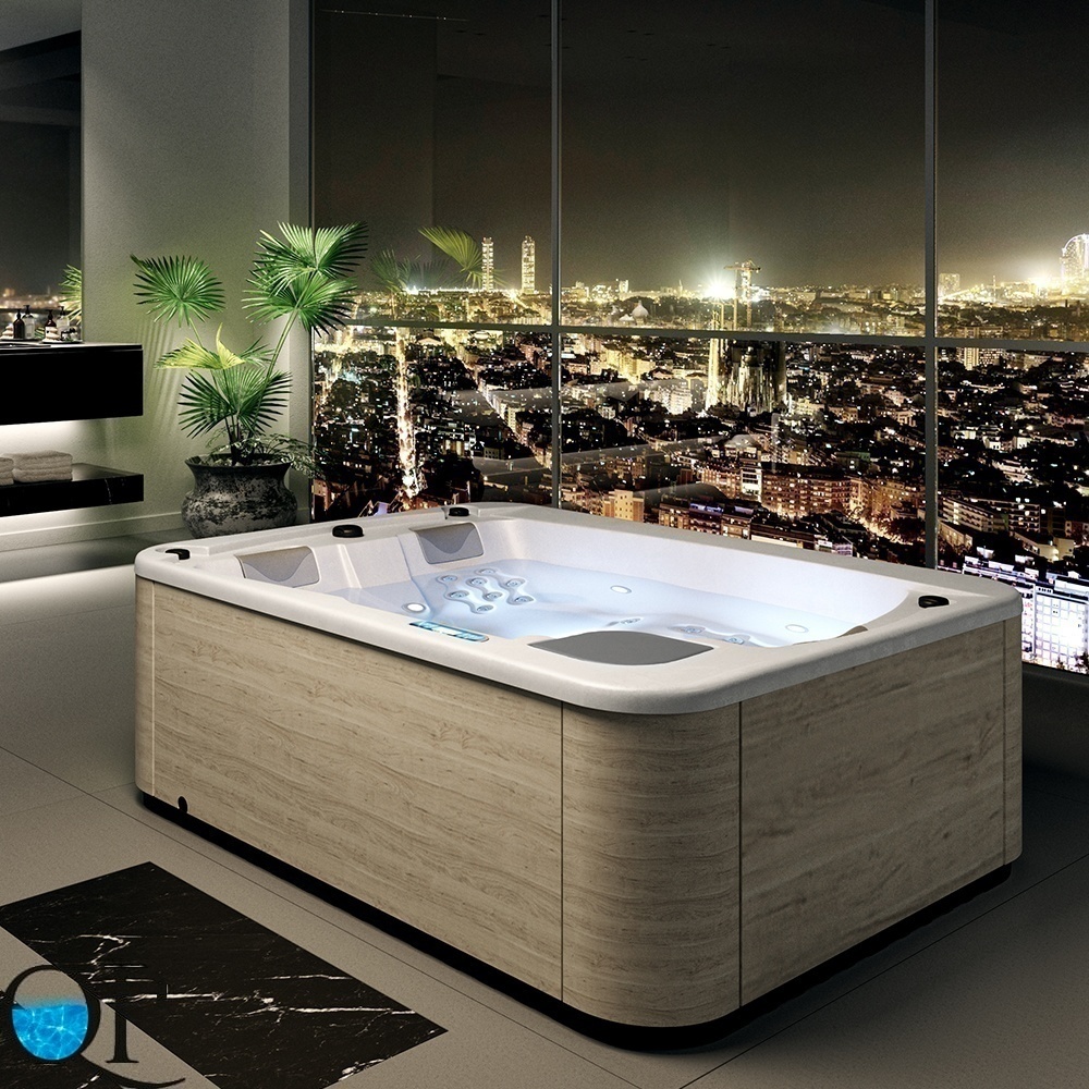 Гидромассажная ванна в деревянном корпусе спроектирована специально для частного использования. Модель оснащается массажными насосами, нагревателем воды и панелью управления, а также имеет функции фильтрации воды через картриджный фильтр и автоматического подогрева воды.
