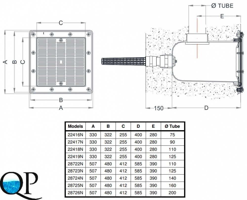 Слив донный NORM для бет. бас., квадратный, 330 x 330, бок. 110 мм, реш. ABS-пластик