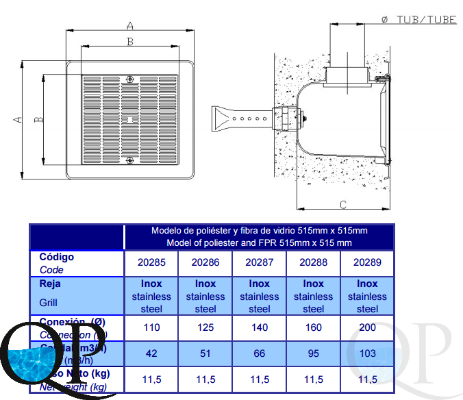 СЛИВ ДОННЫЙ ДЛЯ БЕТ. БАССЕЙНОВ, Д. 160 ММ, 512 x 512, , AISI-316