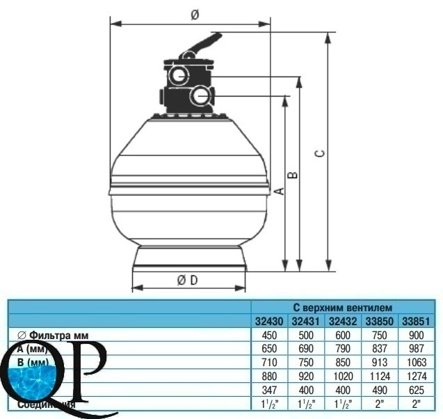 ФИЛЬТР ЛАМИНИРОВАННЫЙ "VESUBIO" С ВЕРХН. ВЕНТИЛЕМ, Д. 750 ММ, 22 М3/Ч, ПОДКЛЮЧЕНИЕ 63 ММ ИЛИ 2", 50 М3/Ч/М2, 2,5 БАР, ВЫСОТА ЗАСЫПКИ