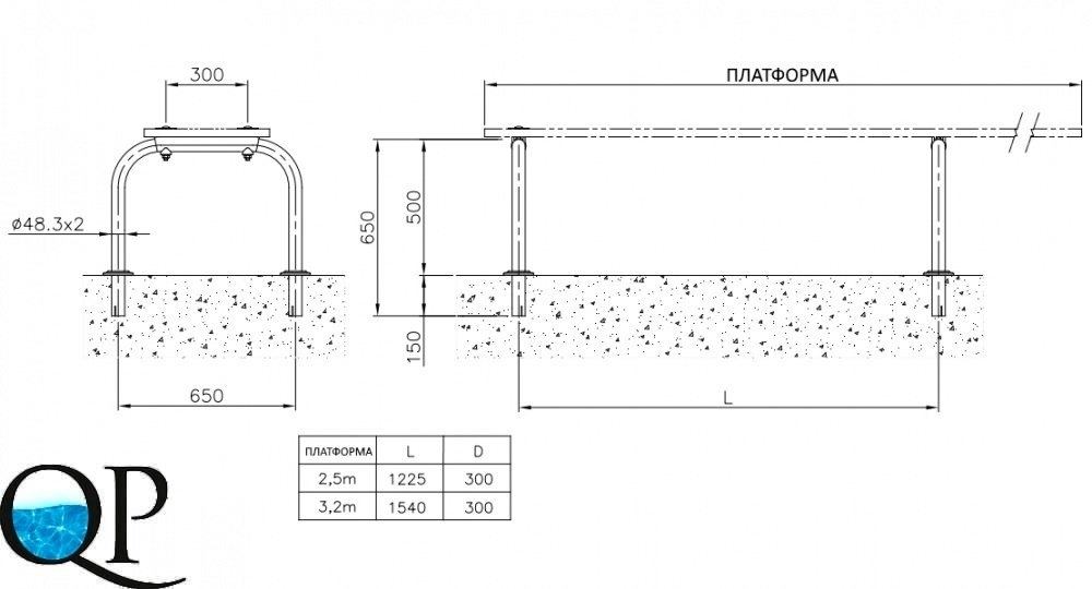 Опоры для трамплинов, длина 2,5-3,2 м, AISI-304