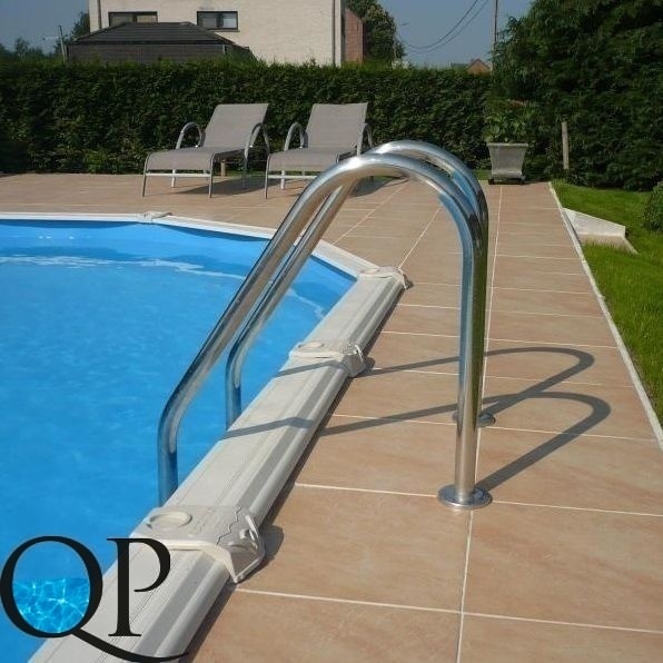 Поручни крепятся к борту при помощи пластиковых стаканов (анкеров). Нижняя часть лестницы упирается в стену бассейна прорезиненной заглушкой. Ступени крепятся к поручням с помощью болтов. Лестница предназначена для заглубленных бассейнов.