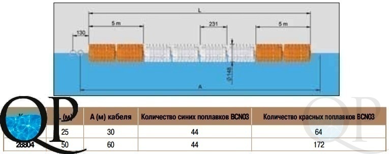Плавающая разметка поставляется с поплавками, 6 мм тросом из нержавеющей стали и крюком. Поплавки без внутреннего механизма из турбинок. Длина - 25 м, длина троса - 30 м, Кол-во синих поплавков - 44 шт, кол-во красных поплавков - 64 шт.