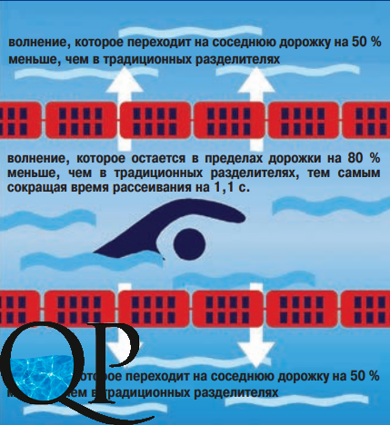 - разделитель дорожек сокращает волны внутри дорожек на 80%. В результате, волна, создаваемая пловцом, практически полностью поглощается, и поверхность воды остается ровной