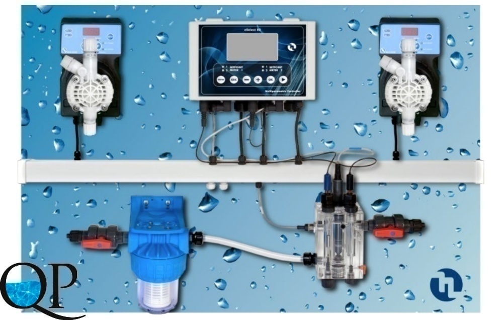 - В основе системы – анализатор жидкости нового поколения eSELECT-M2, с двумя измеряемыми параметрами pH и Cl, с универсальным входным напряжением сети 100–240V; пропорциональные дозирующие насосы серии DLX и проточный потенциостатический датчик свободного хлора Sonda Cl (органический/неорганический хлор)